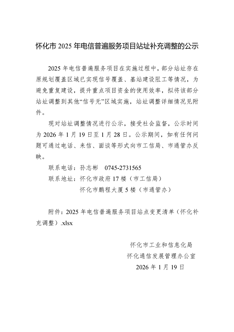 懷化市2025年電信普遍服務(wù)項目站址補充調(diào)整的公示