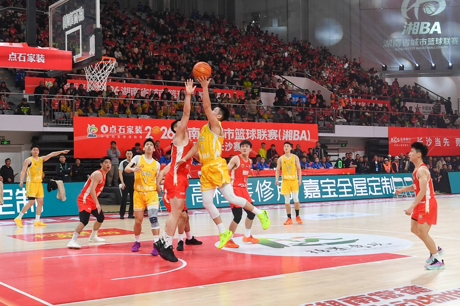 3月27日晚,2026湖南省城市籃球聯(lián)賽(湘BA)開幕式舉行,懷化隊(duì)和長(zhǎng)沙隊(duì)進(jìn)行揭幕戰(zhàn)。圖為懷化隊(duì)米卓突破上籃。(懷化日?qǐng)?bào)全媒體記者 楊智偉 攝)