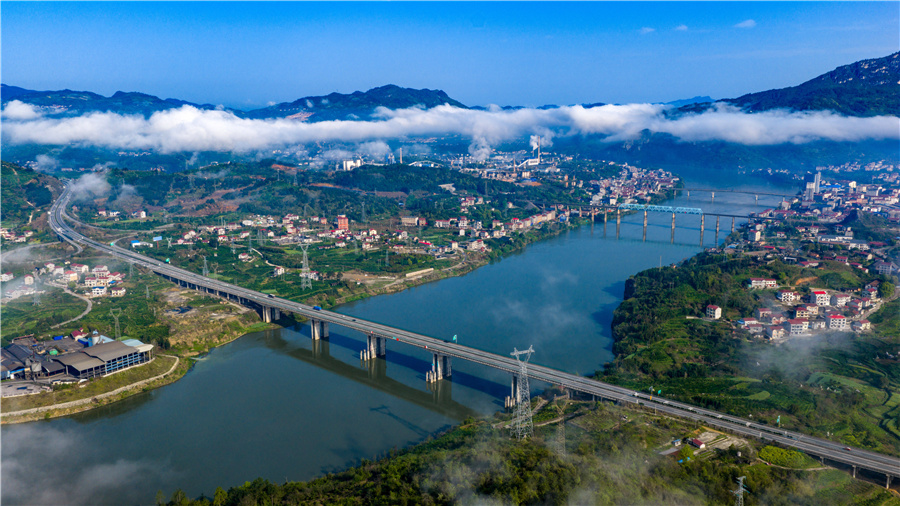 4月4日清晨,溆浦縣大江口鎮(zhèn)云霧繚繞,沅水河畔宛若仙境。高速公路、鐵路、國道三座大橋橫跨江面,在晨霧中若隱若現(xiàn),勾勒出靈動壯美的生態(tài)畫卷。(雷文錄 攝)